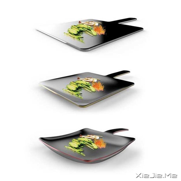 亲们,平时有做菜的时候,我们切完菜之后,要将菜从砧板上面转移到锅里面。但这个时候,很容易会从砧板上面洒掉一点下来。这样就会造成不必要的浪费,设计师Lee Jee Won和Lee Juan依据具有双向记忆效应的记忆合金为基础,提出这样一个概念,使用时将它放在炉灶上加热,随着温度的提升 ,砧板煎锅的边缘会卷曲并会从白色变成黄色 ,直到变成有红色边缘的理想平底锅;而当温度回升后,它又会恢复平板砧板的形状。我想说,这么厉害的东西,啥时候能真正实现,是一个问题。